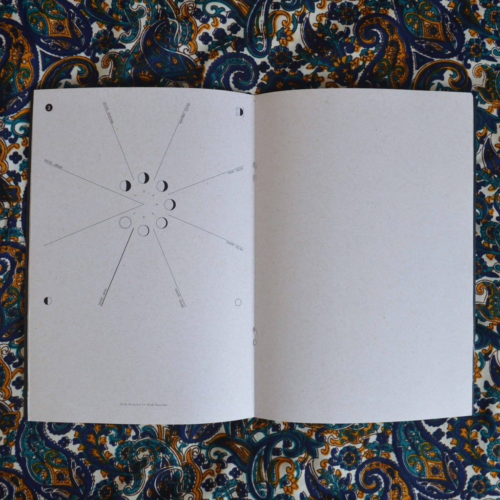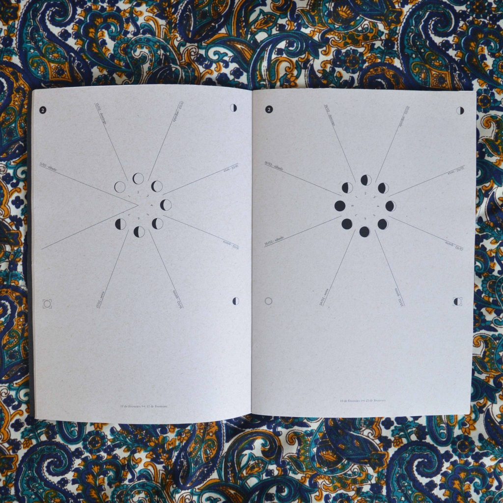 A passagem dos dias não como uma linha reta, mas como um círculo. Em um formato bonito e portátil, a edição permite a dupla função de agenda semanal de atividades junto a de sincronário com o tempo lunar, propondo outra visão sobre o calendário gregoriano (o mais utilizado no ocidente).