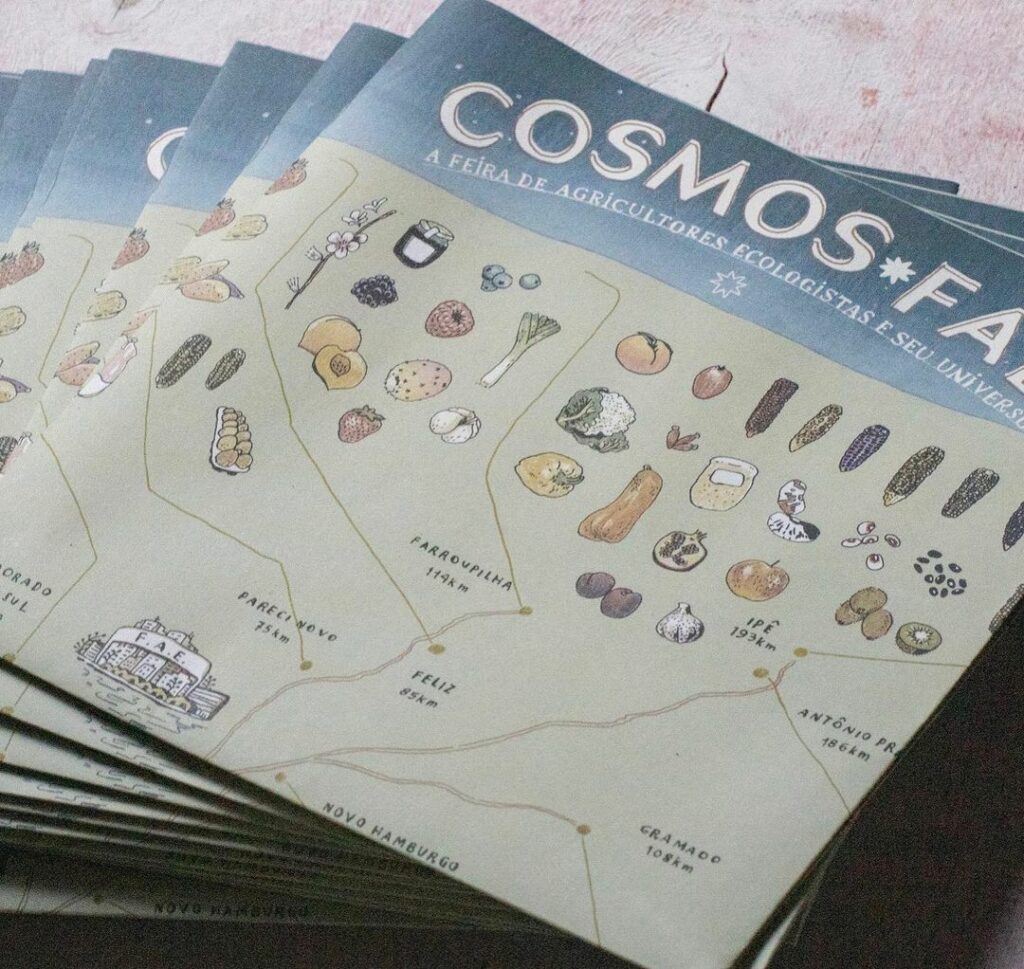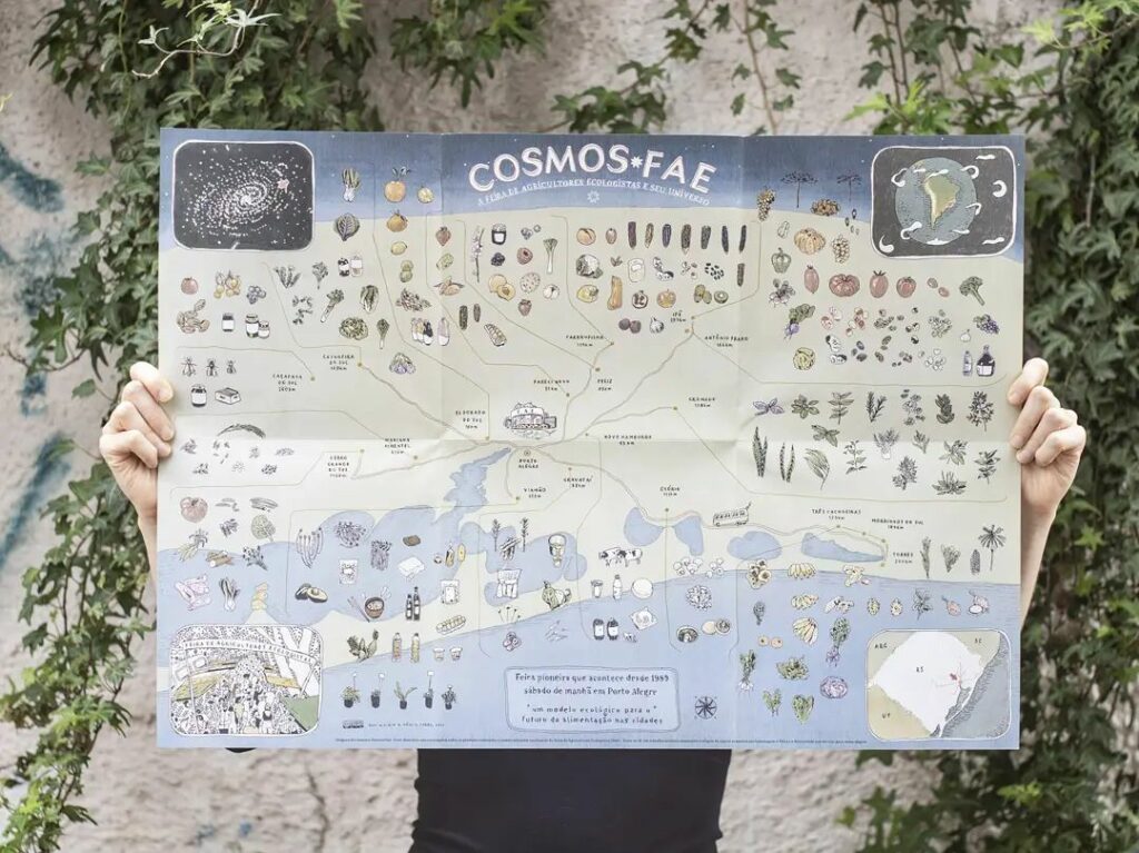 O poster “Cosmos-FAE” traduz parte do universo da Feira a partir dos encontros e pesquisas feitas nos últimos três anos para o documentário “Mãos à Terra” (em pós-produção). De um lado do impresso, esse universo é disposto no espaço: vemos de onde vêm a diversidade de alimentos vendidos na feira e a curta distância percorrida até a venda. Do outro lado, uma disposição no tempo: 32 fatos dão uma pincelada sobre a trajetória desses 32 anos de combate ao agrotóxico, defesa da saúde no campo e diversidade alimentar.