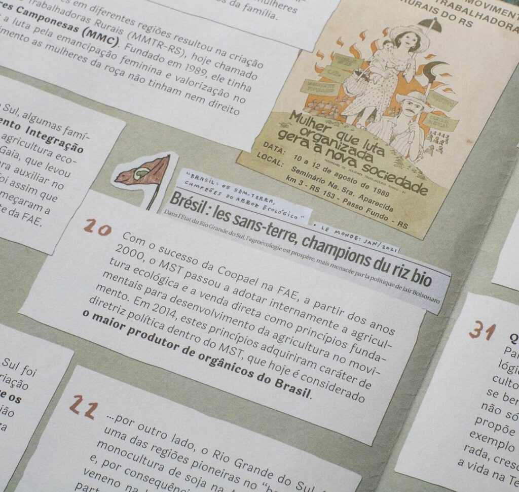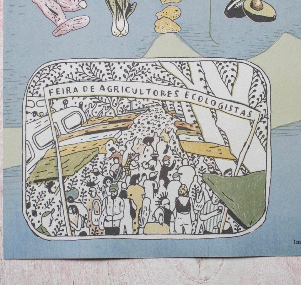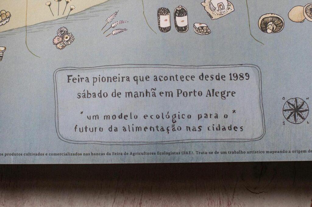 A publicação é um misto de pôster e informativo, em comemoração a Feira de Agricultores Ecologistas (FAE) de Porto Alegre, que em outubro de 2021 completou 32 primaveras. A primeira feira de alimentos ecológicos do Brasil, e provavelmente a maior do continente, é resultado de uma rede local tecida diretamente entre quem produz e quem consome. Sua história traz confluências diversas, desde movimentos ambientalistas a cooperativas, MST e MMC (Mulheres Camponesas), até as Pastorais da Terra, Teologia da Libertação e espiritualistas filosóficos como GFU (Grande Fraternidade Universal).